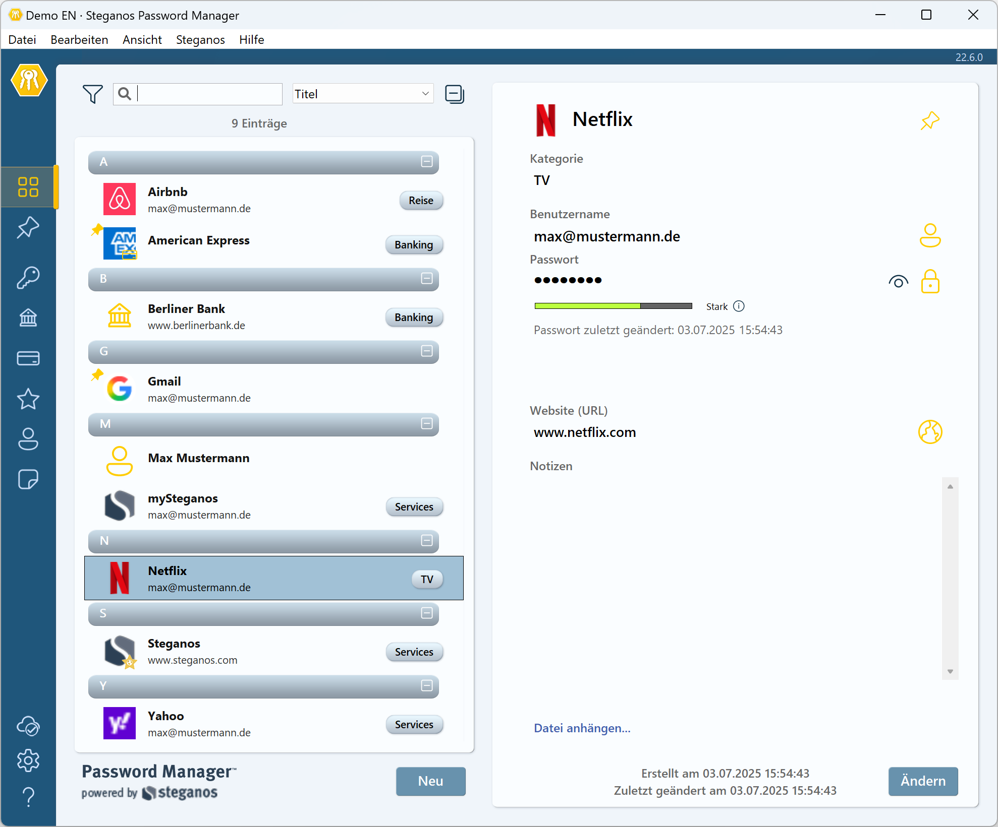 Steganos Passwort-Manager verwendet eine starke AES 256-Bit-Verschlüsselung mit PBKDF2-Schlüsselableitung, die für maximale Sicherheit sorgt und Ihre Schlüsselbunde unknackbar macht.Automatisches Ausfüllen von Passwörtern (Autofill) unter Windows, iOS und Android